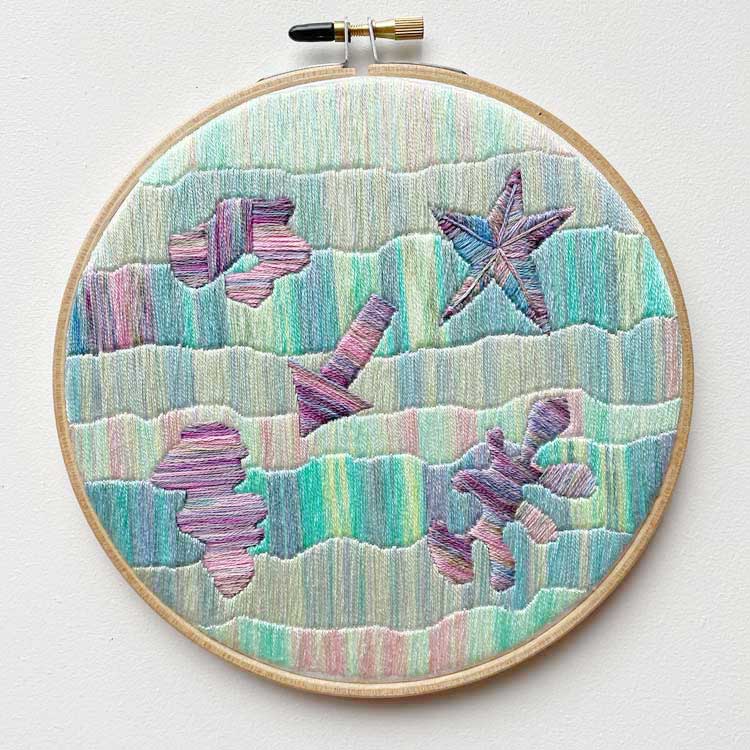 6.25″ hoop, hand dyed multi-color floss featuring full abstract design