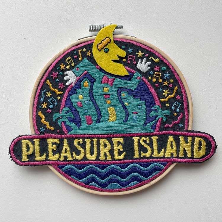 6.5″ hoop, hand stitched throwback to disney’s original pleasure islando signage